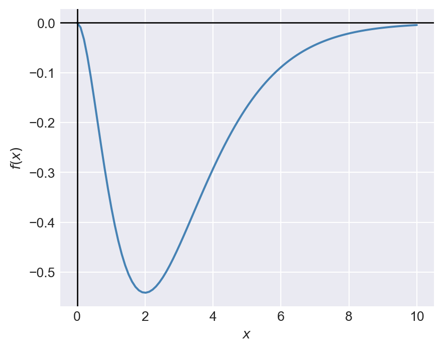 Figure 8.1 indicates that the function has a minimum at \(x=2\). We can use the minimize_scalar function to confirm that \(x=2\) is indeed the minimum. In the code below, we first define the function f(x), then use the minimize_scalar function with the bounded method to find the value of \(x\) that minimizes \(f(x)\) over the interval \([0, 10]\).