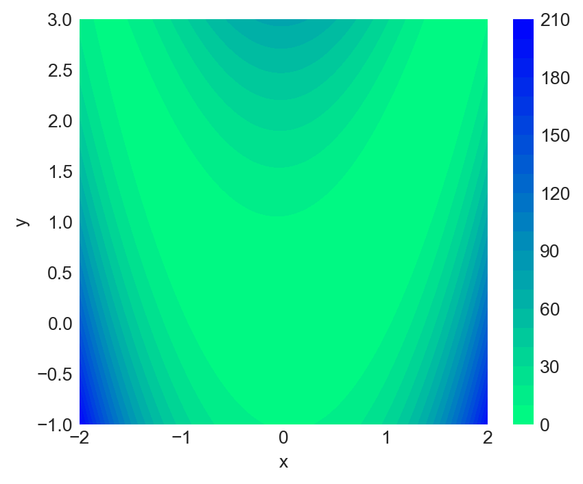 cp = plt.contourf(X, Y, Z, levels=20, cmap=cm.winter_r)