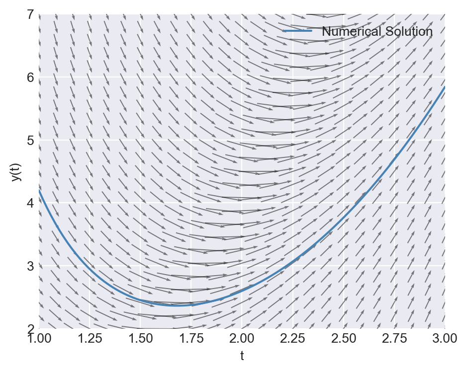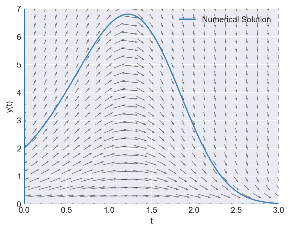 Finally, we plot the numerical solution together with the direction field of the ODE. The plot shows that the arrows are tangent to the numerical solution, indicating that the solver has accurately captured the behavior of the system.