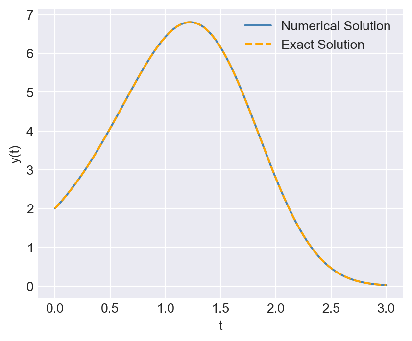 In our case, \(a(t)=t^2-1.5\) and \(b(t)=0\). Therefore, its exact solution is given by \(y(t)=2e^{-(2t^3-9t)/6}\). We will compare this exact solution with the numerical solution obtained using the solve_ivp function.