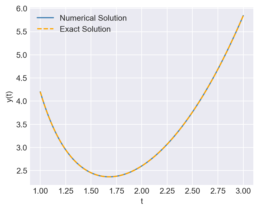 Using Equation 8.1, we can show that the exact solution of the ODE is given by \(y(t)=\frac{t^3}{5}+\frac{4}{t^2}\). In Figure 8.9, we compare the numerical solution with the exact solution by plotting both solutions on the same graph.