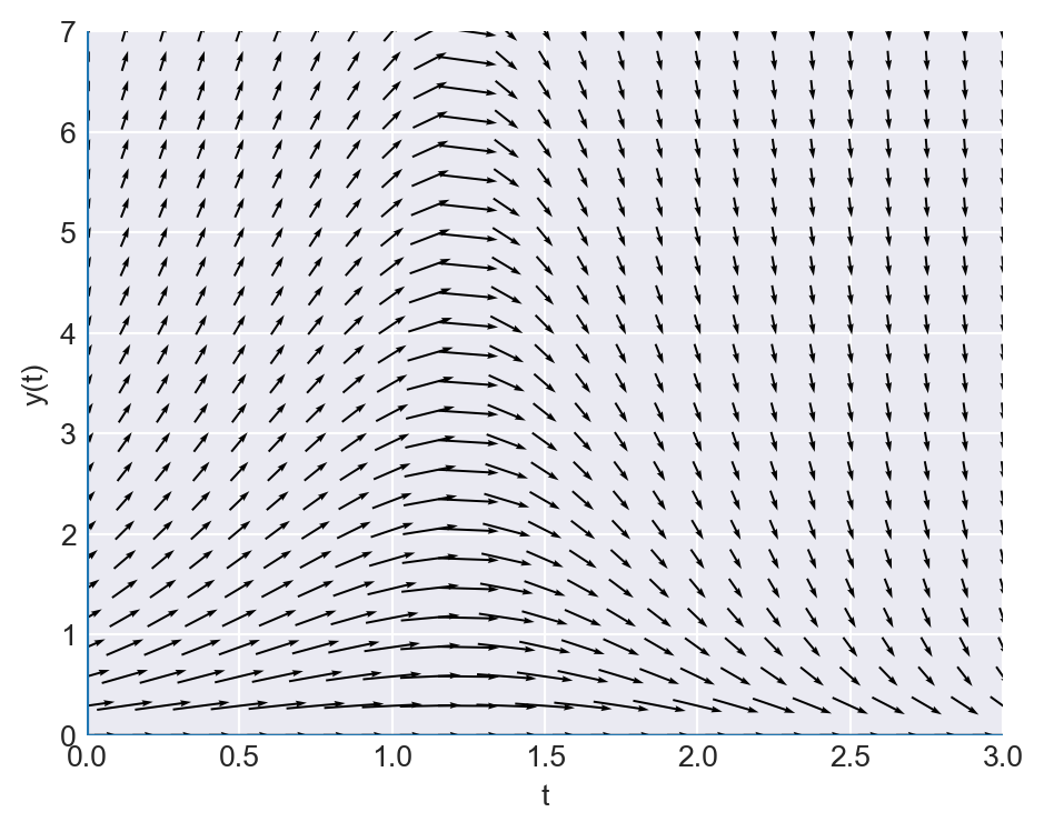 The directional field of the ODE shows the slope of the solution curve at each point in the \(t\)-\(y\) plane. That is, it shows the slope \(\frac{dy(t)}{dt}=-yt^2+1.5y\) at each point \((t,y)\). The direction field can be generated using the quiver function from Matplotlib. In the code below, we create a mesh grid of points in the \(t\)-\(y\) plane and compute the direction vectors at each point. We then use the quiver function to plot the direction field, as shown in Figure 8.6. The solution curve (integral curve) of the ODE will follow the direction of the arrows. At each point, the slope of the solution curve is given by the direction of the arrow.