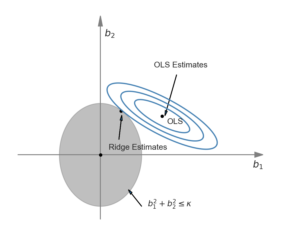 To understand why the ridge estimator shrinks the OLS estimator, we can alternatively express the ridge minimization problem as a constrained minimization problem: \[ \widehat{\beta}_R=\argmin_{b:\sum_{j=1}^kb_j^2\le \kappa} SSR(b), \tag{24.5}\] for some constraint parameter \(\kappa>0\). Then, the Lagrangian for the constrained minimization yields \[ \widehat{\beta}_R=\argmin_{b} \left(SSR(b) + \lambda_R\left(\sum_{j=1}^kb_j^2 - \kappa\right)\right), \] where \(\lambda_R\) is the Lagrangian multiplier.