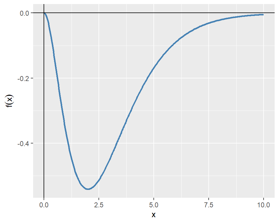 The following chunk indicates that the function has a minimum point at \(x^*=2\) with a minimum value of approximately \(f(x^*)=-0.5413\).