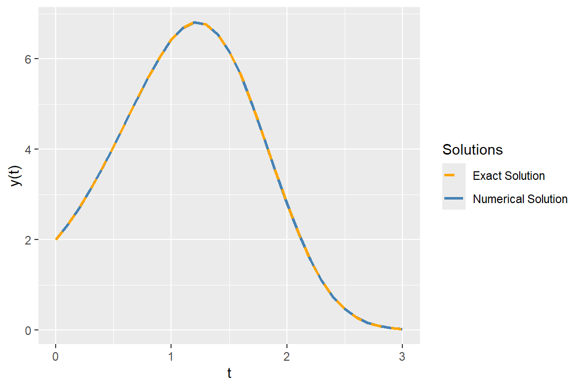 ode_solution <- ode(y = y0, times = times, func = ode_func, parms = NULL)In the following figure, we plot the numerical solution obtained using the ode function together with the exact solution. The plot shows that the numerical solution closely matches the exact solution.