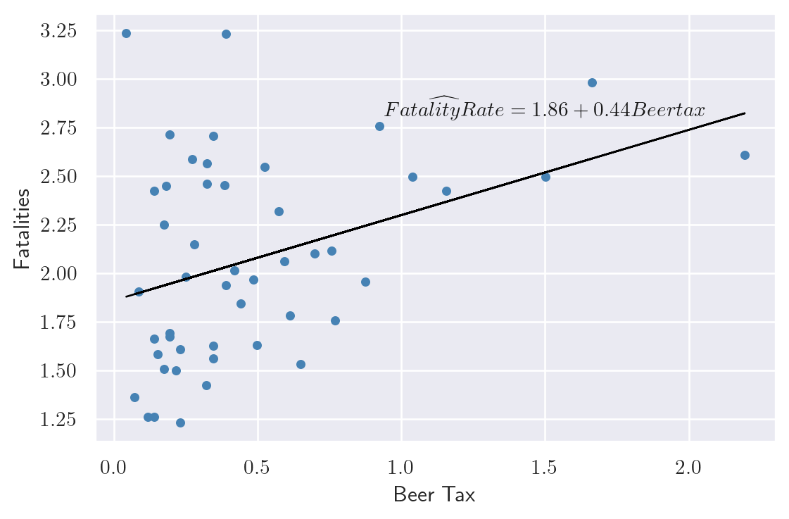 where \(\text{FatalityRate}_{it}\) is the vehicle fatality rate in state \(i\) in year \(t\), and \(\text{BeerTax}_{it}\) is the real tax on a case of beer in state \(i\) in year \(t\).