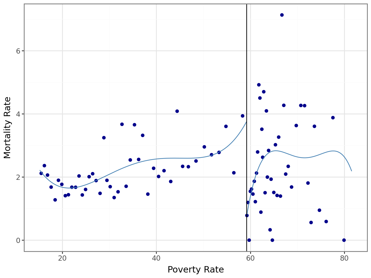 Ludwig and Miller (2007) use a sharp RDD to study the effect of a federal grant-writing assistence for the federal anti-poverty program called Head Start on child mortality rates in the United States. The Head Start program, founded in 1965, provides funds to local municipalities for preschool, health, and social services for poor children aged three to five and their families.3 The poverty rate measured in 1960, with a cutoff of 59.1984, is used to determine whether a county is eligible for federal grant-writing assistance. This cutoff results in 300 counties being eligible to receive such assistance. The poverty rate measured in 1960, with a cutoff of 59.1984, is used as the running variable to form the treatment and control groups. This cutoff poverty rate results in 300 counties being eligible to receive grant-writing assistence. The outcome variable \(Y\) is the county mortality rate during the 1973-1983 period. The dataset is contained in the LM2007.dta file, which is obtained from Hansen (2022). Some of the variables included in the dataset are listed below: