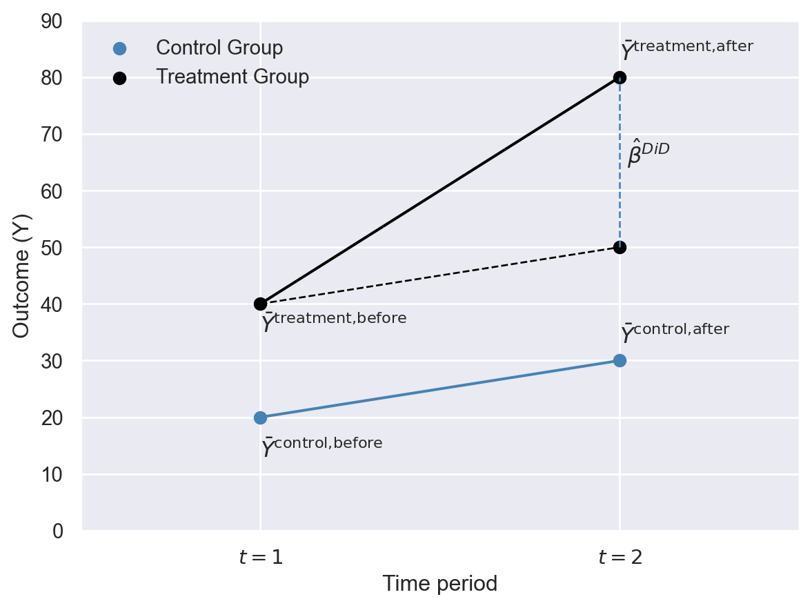 Definition 22.4 (Difference-in-means estimator) The OLS estimator \(\hat{\beta}_1\) in Equation 22.3 is called the difference-in-means estimator or differences estimator.