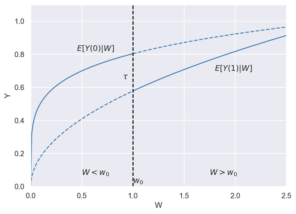 Definition 22.6 (Average treatment effect at the threshold) The average treatment effect at the threshold \(w_0\), denoted by \(\tau\), is defined as \[ \tau=\E[Y_i(1)-Y_i(0)|W_i=w_0]. \]