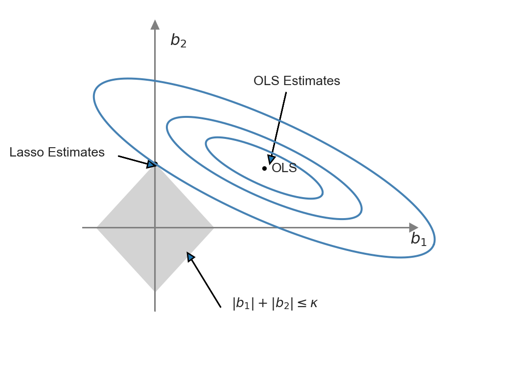 To understand why the ridge estimator shrinks the OLS estimator, we can alternatively express the ridge minimization problem as a constrained minimization problem: \[ \widehat{\beta}_R=\argmin_{b:\sum_{j=1}^kb_j^2\le \kappa} SSR(b), \tag{23.5}\] for some constraint parameter \(\kappa>0\). Then, the Lagrangian for the constrained minimization yields \[ \widehat{\beta}_R=\argmin_{b} \left(SSR(b) + \lambda_R\left(\sum_{j=1}^kb_j^2 - \kappa\right)\right), \] where \(\lambda_R\) is the Lagrangian multiplier.