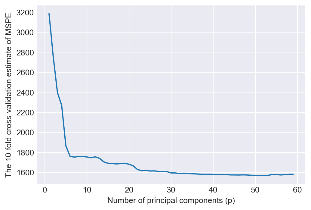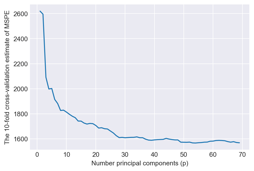 In Figure 23.7, we plot the 10-fold cross-validation estimate of the MSPE against the number of principal components used as regressors. The figure shows that the MSPE becomes flat after p=50.