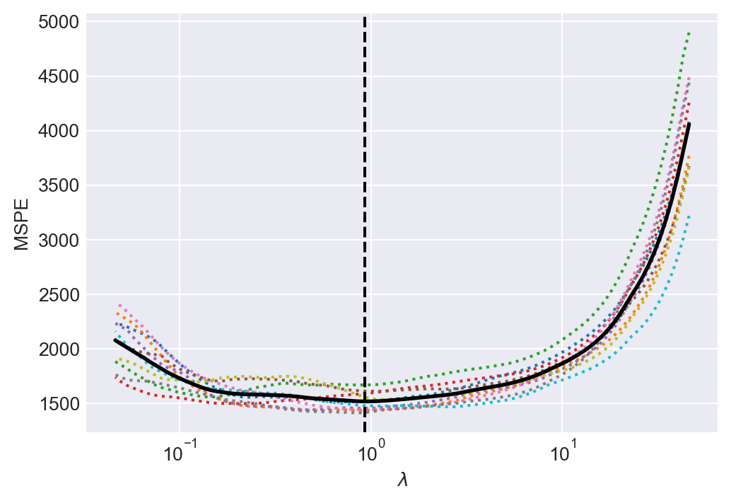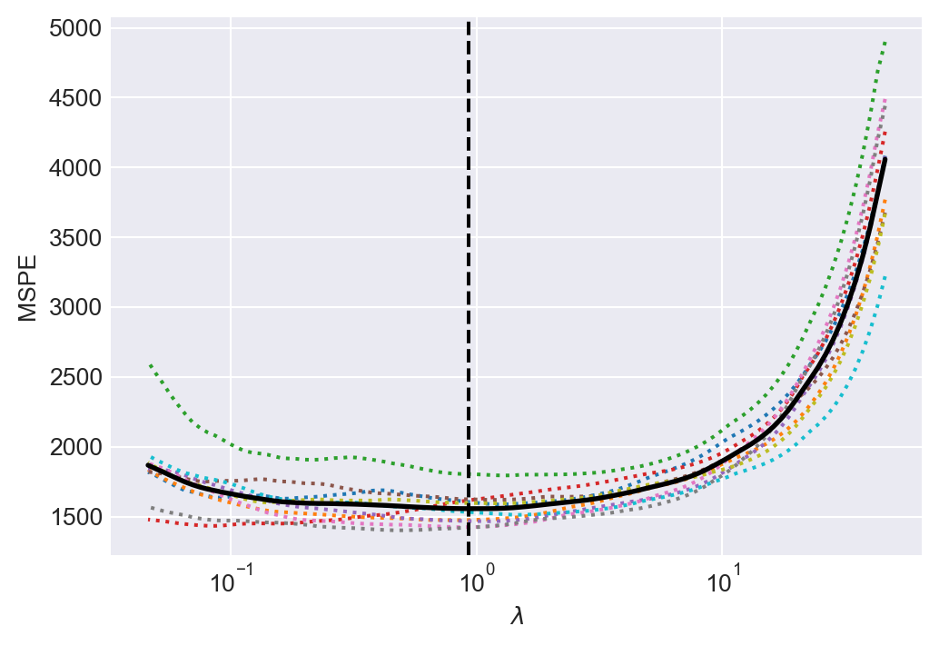 print(f"The out-of-sample RMSPE of Ridge regression = {np.round(vlarge_rmse_oos_ridge,1)}") Ridge shrinkage parameter chosen by CV in the very large case = 2511.88643150958