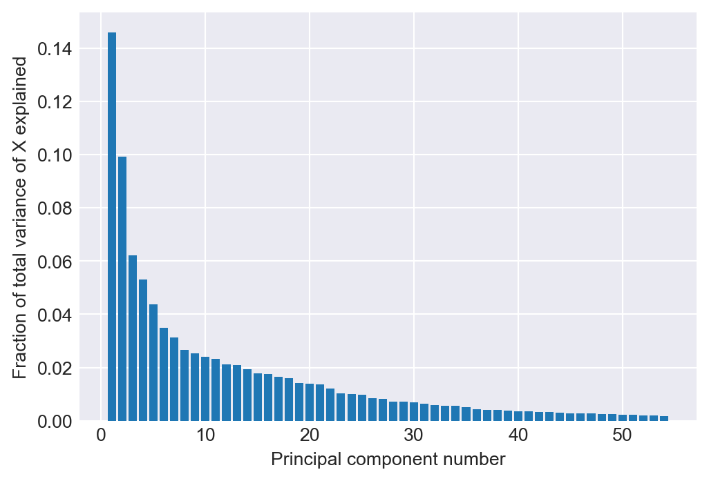 plt.show()The scree plot given in Figure 23.8 indicates that the first principal component explains around \(15\%\) of the variance of 2065 predictors.