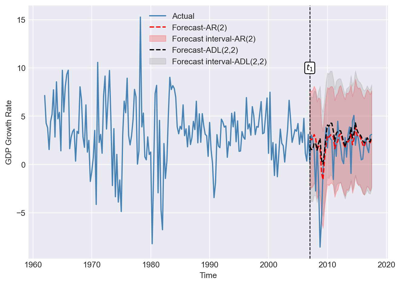 Based on our results in Table 24.13 and Figure 24.21, we conclude that-aside from the large forecast error in 2008:Q4-the performance of the ADL(\(2,2\)) forecasting model during the pseudo-out-of-sample period (2003:Q1–2017:Q4) is relatively better than its performance during the in-sample period (1981:Q1–2002:Q4).