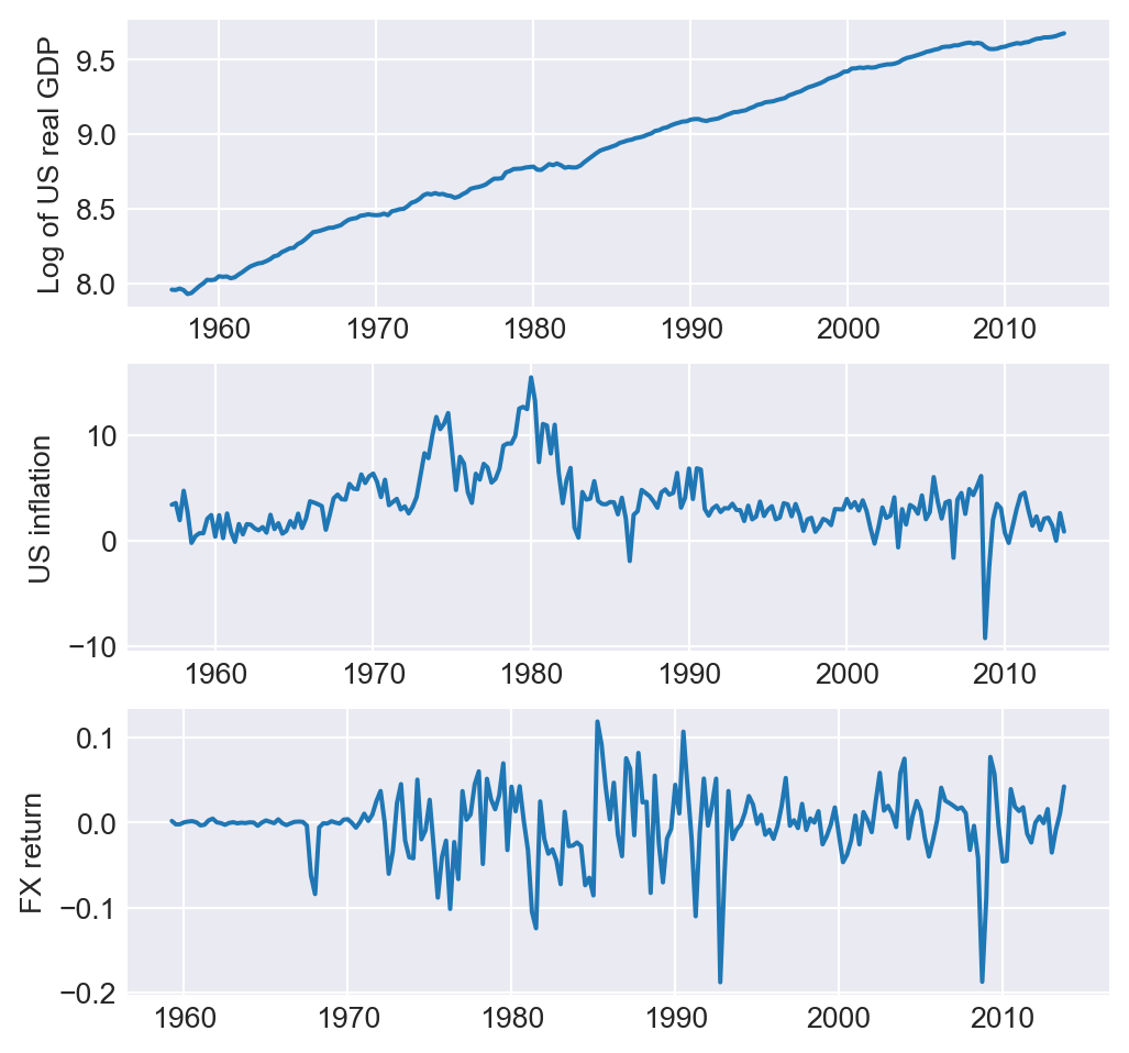 As another example, we consider the quarterly macro economic data on the U.S. contained in the us_macro_quarterly.xlsx file. This file includes quarterly data on several macroeconomic variables from 1957:Q1 to 2013:Q4. The data set contains the following variables: