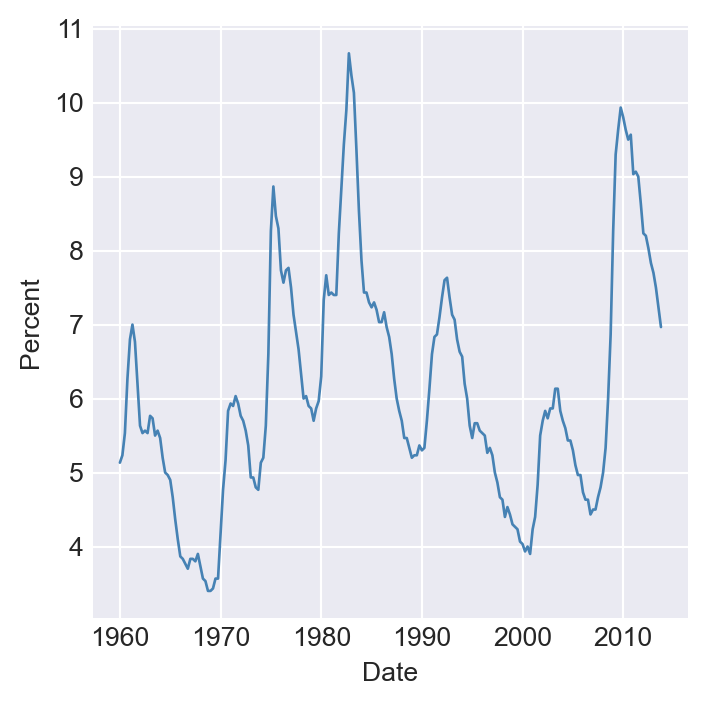 From here on, we will consider only consecutive, evenly-spaced observations (for example, quarterly observations from 1962 to 2004, with no missing quarters). Missing and unevenly spaced data introduce complications, which we will not consider in this chapter.