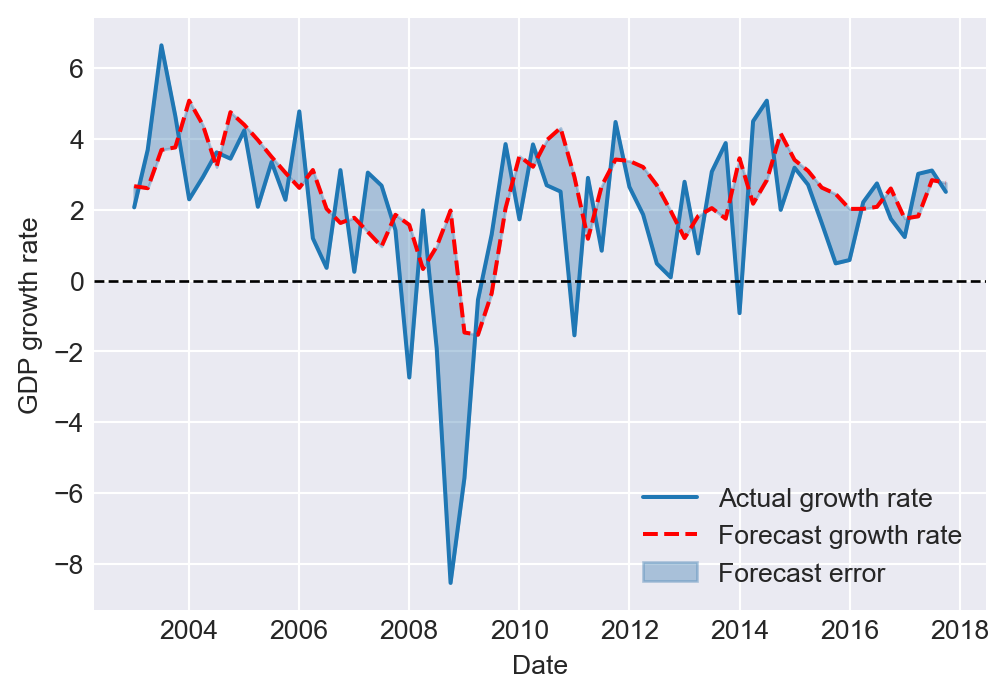 In Figure 24.21, we plot the actual growth rate, the forecasted growth rate, and the forecast errors. The forecasted growth rate closely tracks the actual U.S. GDP growth rate, except for a single period in 2008:Q4, when the forecast error is notably large.