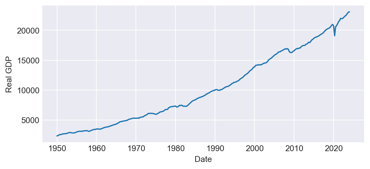 To download time series data from well-known resources, we can use the pandas_datareader library. For further details, see pandas_datareader.data.DataReader. For example, in the following code chunk, we download the U.S. real GDP data from the Federal Reserve Economic Data (FRED) database using the DataReader function in pandas_datareader.