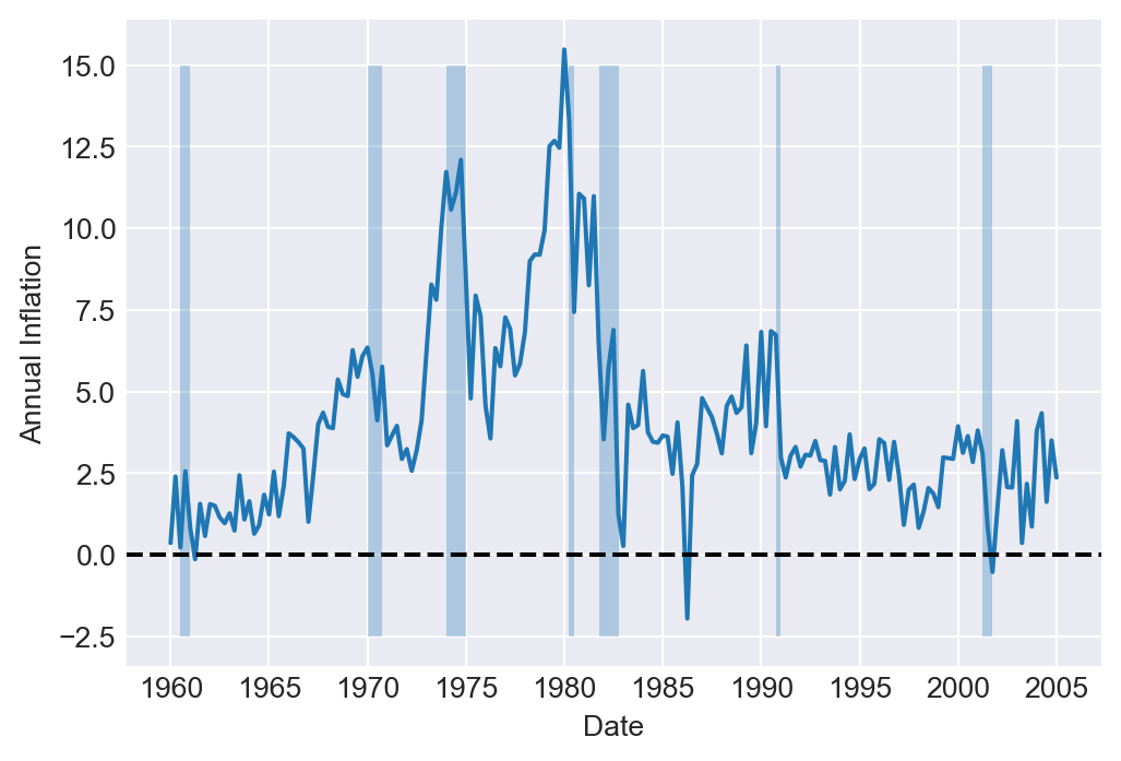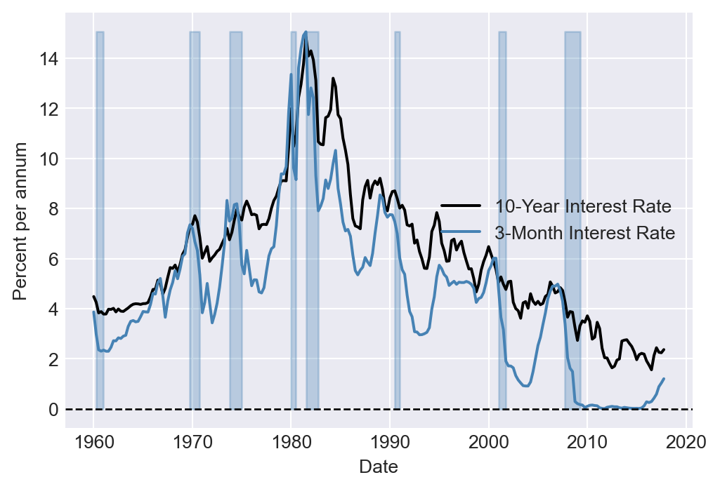 Figure 24.1 shows the time series plot of real GDP and its annual growth rate from 1960 to 2017. The shaded areas in the figure represent recession periods, during which the real GDP growth rate is negative.