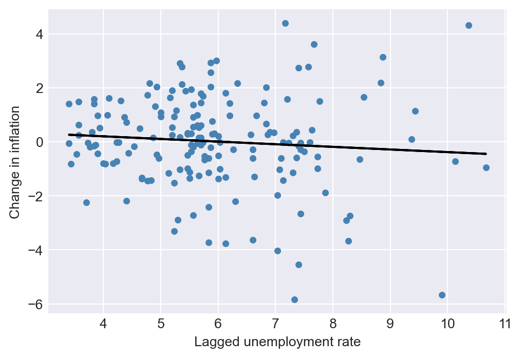 ARDL_44 = smf.ols(formula = 'Delta_Inf ~ L1_Delta_Inf + L2_Delta_Inf + L3_Delta_Inf + L4_Delta_Inf + L1_u_rate + L2_u_rate + L3_u_rate + L4_u_rate +\