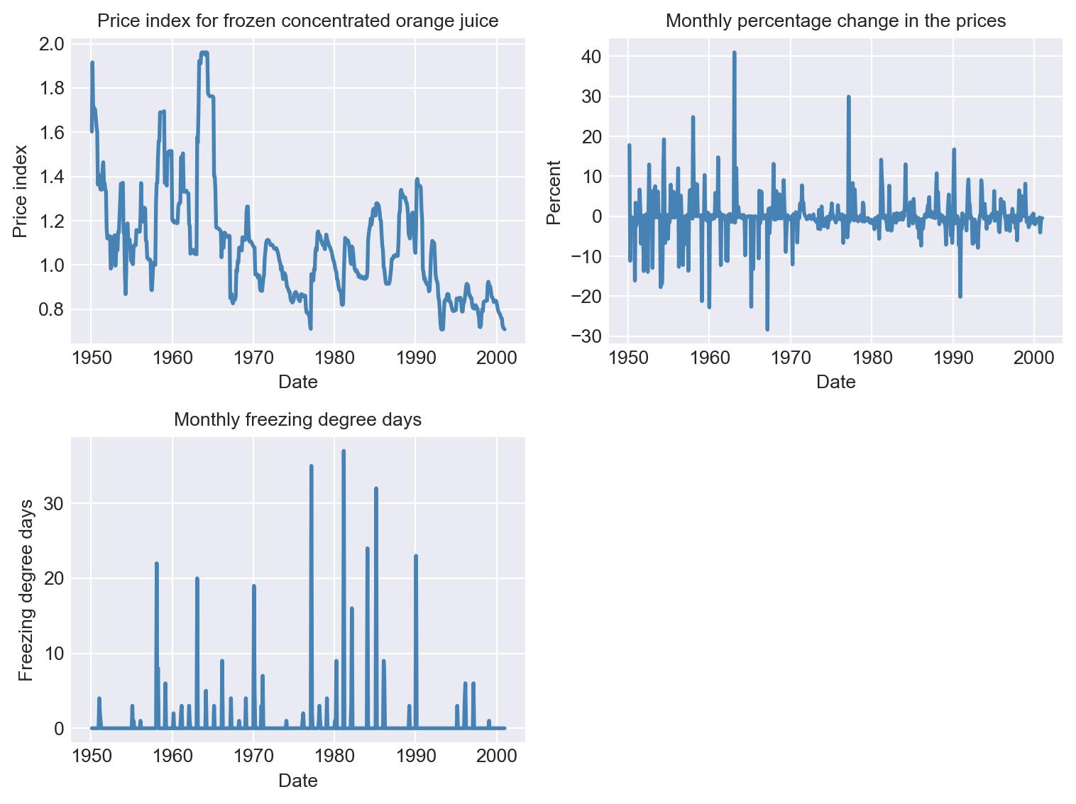We consider a dataset on frozen concentrated orange juice prices collected from Orlando, Florida. The dataset is monthly and spans from January 1950 to December 2000. It contains the following variables: