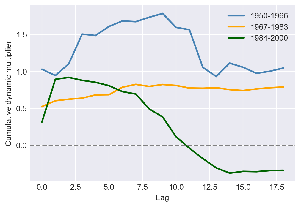 Finally, we examine whether the dynamic multipliers have remained stable over time. One way to assess this is by estimating these multipliers for different subperiods of the sample. For example, we consider the periods 1950–1966, 1967–1983, and 1984–2000. If the multipliers are consistent across all three periods, their estimates should be similar, and the estimated cumulative multipliers should also align. To investigate this, we re-estimate Model 2 for each subperiod and compare the estimated cumulative dynamic multipliers in Figure 25.4. The figure shows that the estimated cumulative dynamic multipliers are relatively larger in the first subperiod compared to the other two subperiods. This suggests that the effect of freezing degree days on real prices has decreased over time.