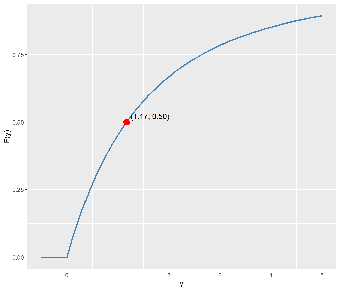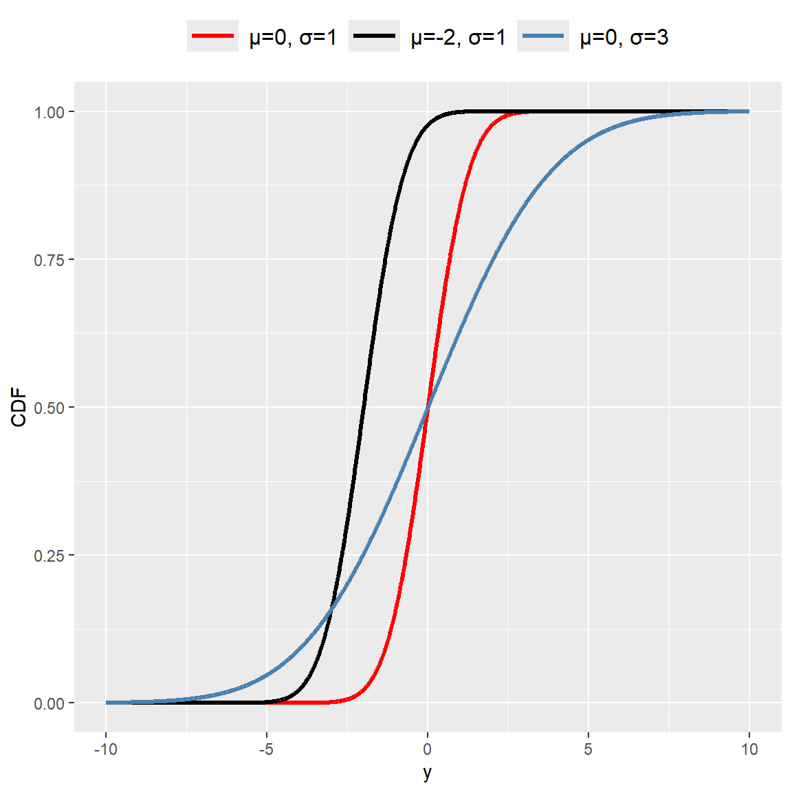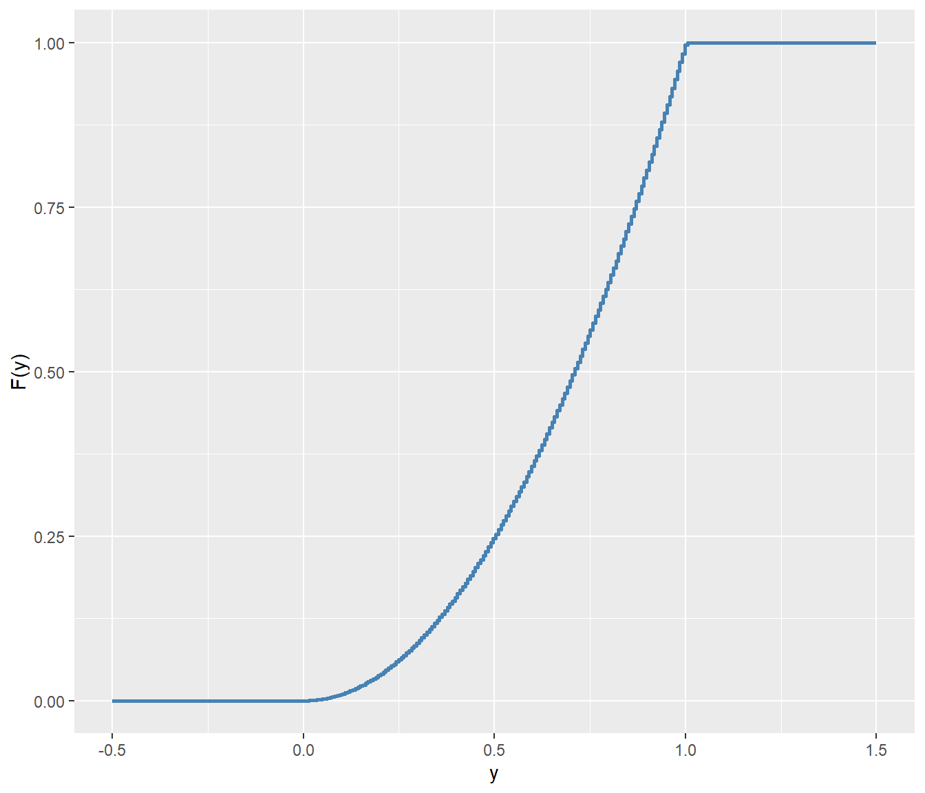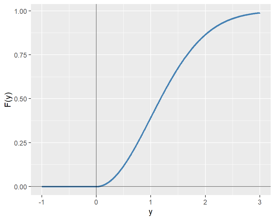 Definition 11.5 (Cumulative distribution function (CDF)) Let \(Y\) be a discrete random variable with probability distribution \(P(Y=y)\). Then, the CDF of \(Y\), denoted by \(F_Y\), is defined as \[ F_Y(y)=P(Y\leq y)=\sum_{y^{*}\leq y} P(Y=y^{*}), \] where the sum is over all possible values \(y^{*}\) of \(Y\) that are less than or equal to \(y\).