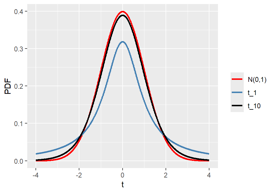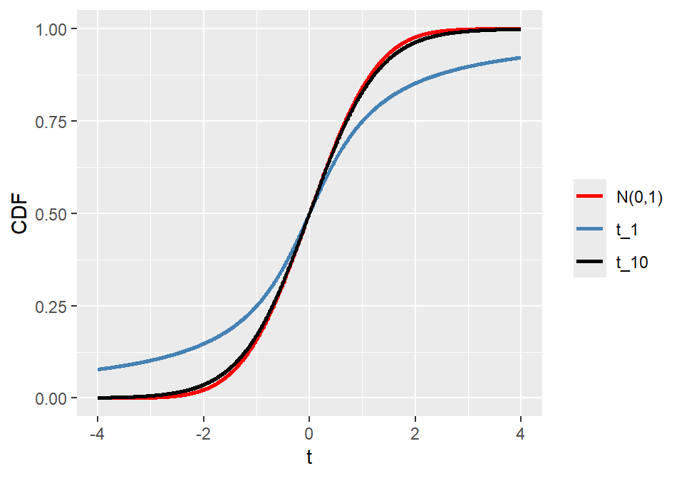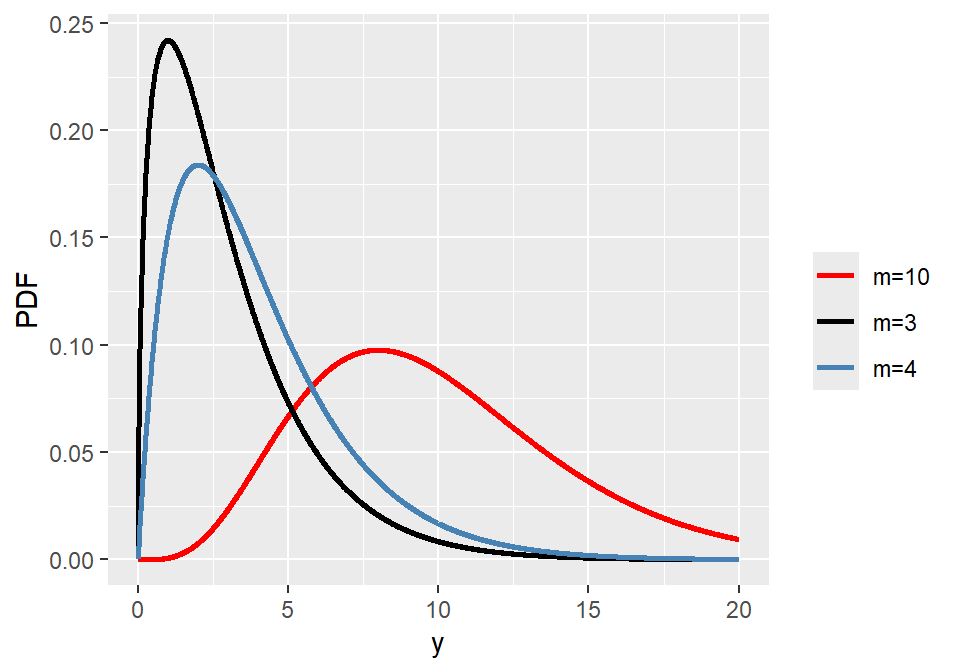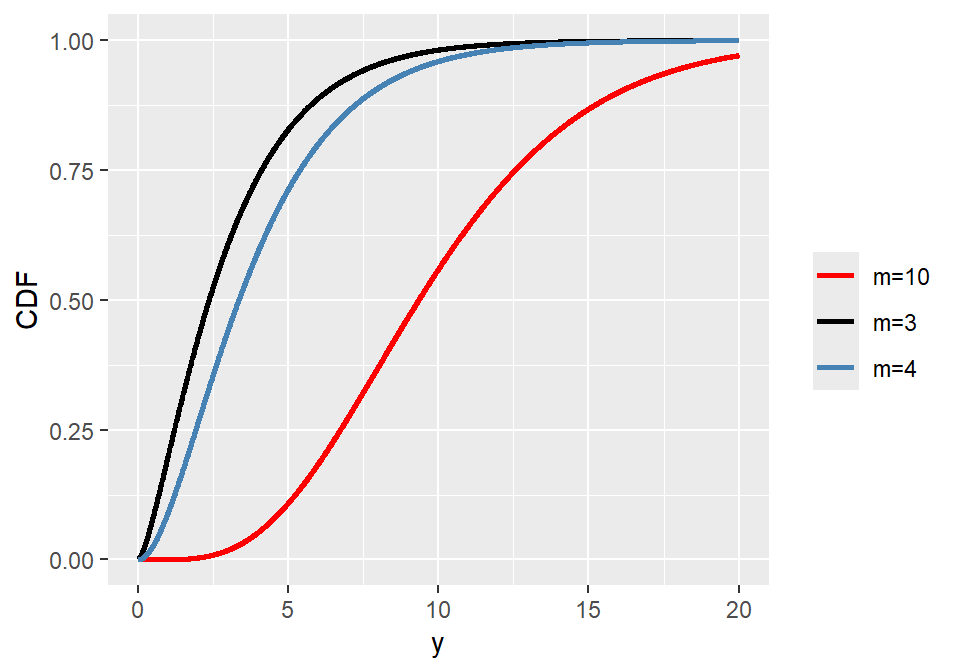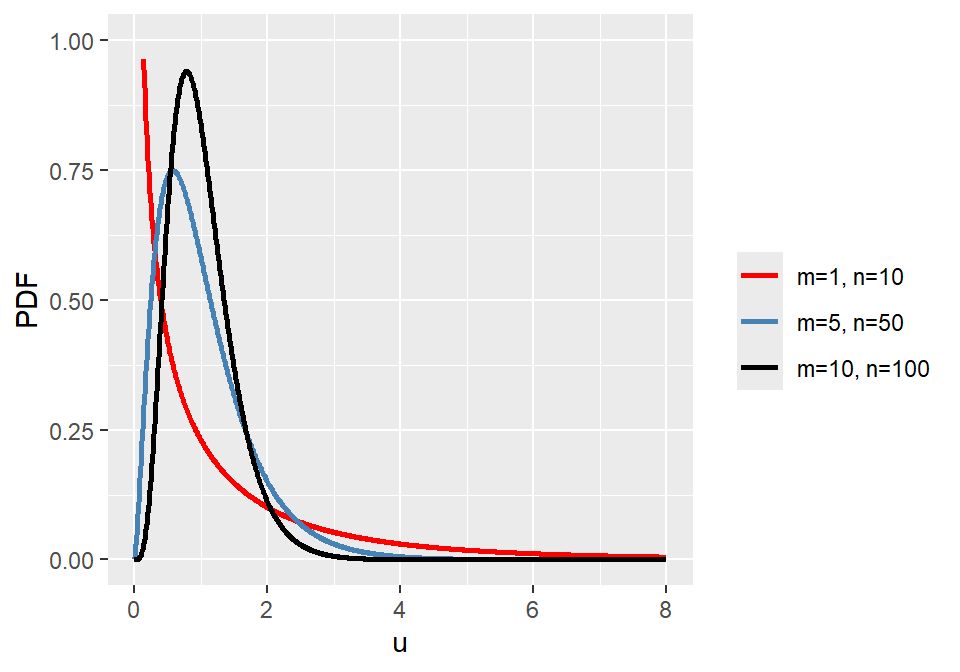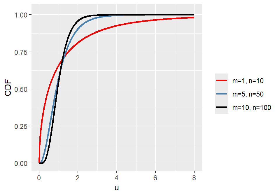 In econometrics, an important special case of the \(F\) distribution arises when the denominator degrees of freedom is large enough that the \(F_{m,n}\) can be approximated by \(F_{m,\infty}\). \(F_{m,\infty}\) distribution is the distribution of a chi-squared random variable with \(m\) degrees of freedom divided by \(m\), i.e., \(F_{m,\infty}=W/m\), where \(W\sim\chi^2_m\).