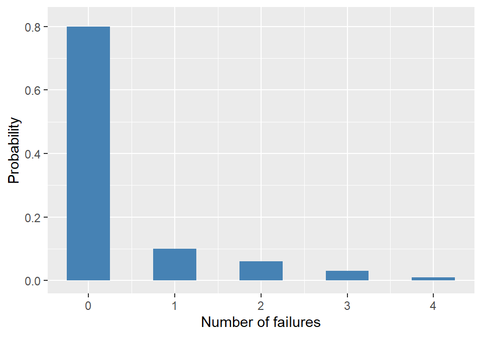 The probability of an event can be computed from the probability distribution. For example, the probability of the event of one or two failures is the sum of the probabilities of the constituent outcomes: \(P(\{M=1\}\cup \{M=2\})=P(M=1)+P(M=2)= 0.16\).