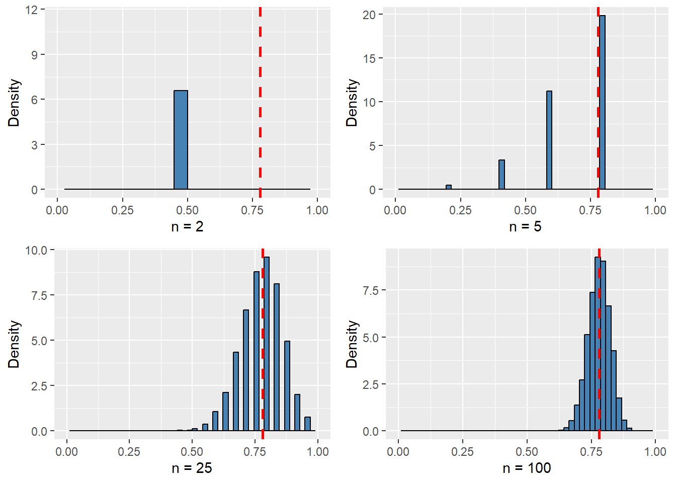To illustrate the law of large numbers, assume that \(Y_1, \dots, Y_n\) are i.i.d. random variables from a Bernoulli distribution with success probability \(p = 0.78\). We consider the sampling distribution of \(\bar{Y}\) for various sample sizes \(n\). According to the law of large numbers, \(\bar{Y}\) should converge in probability to \(0.78\) as \(n\) becomes larger. Figure 11.20 shows the sampling distribution of \(\bar{Y}\) for \(n \in \{2, 5, 25, 100\}\). We observe that the variance of the sampling distribution of \(\bar{Y}\) decreases as \(n\) increases, causing the distribution to become more tightly concentrated around its mean, \(\mu_Y = 0.78\), represented by the vertical dashed line in red.