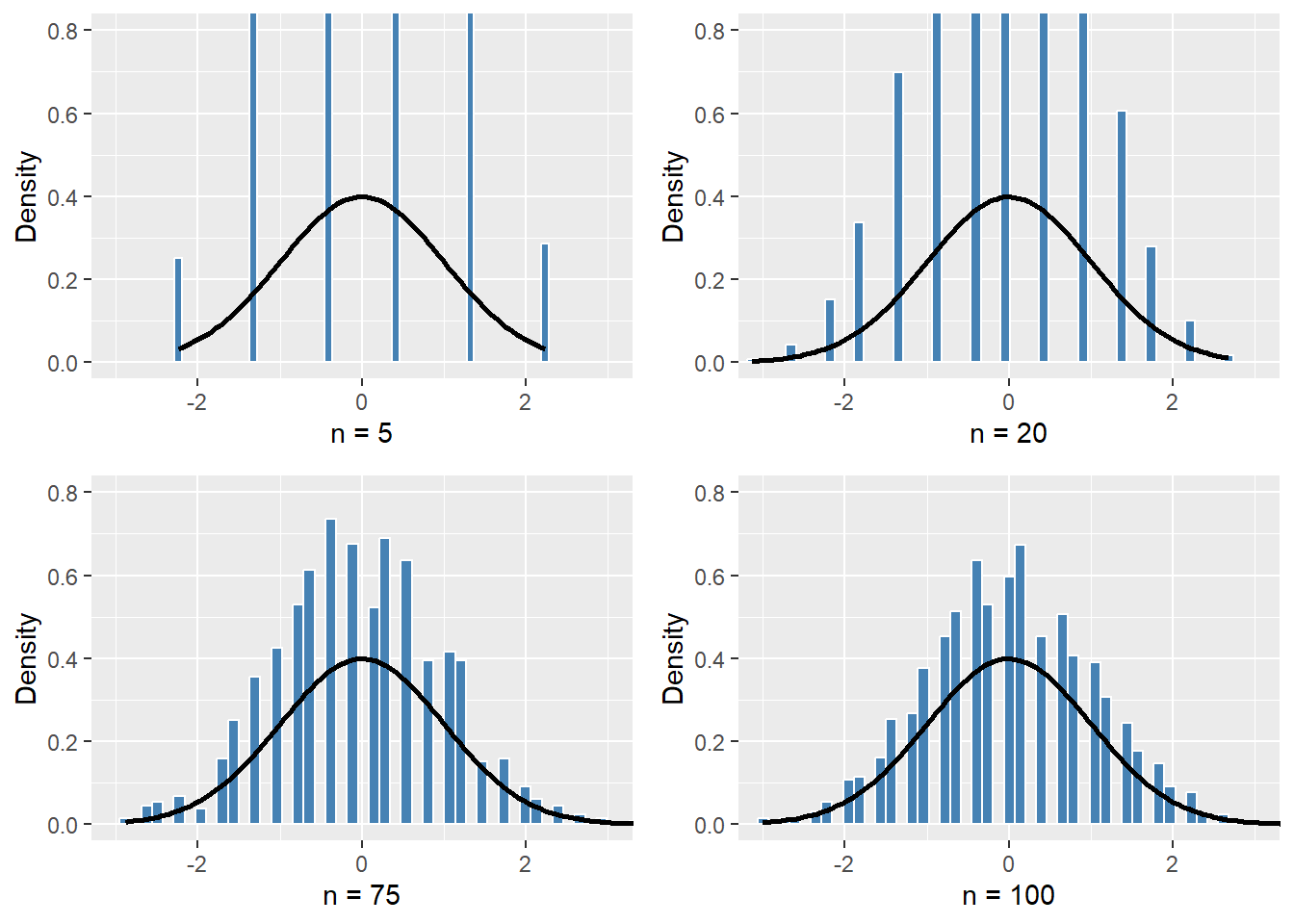 The CLT implies that \(\bar{Y}\sim N(\mu_Y,\sigma^2_Y/n)\) when \(n\) is large. To illustrate the CLT, assume that \(Y_1, \dots, Y_n\) are i.i.d. random variables from a Bernoulli distribution with success probability \(p = 0.5\). We consider the sampling distribution of \(\frac{\bar{Y}-\mu_Y}{\sigma_Y/\sqrt{n}}\) for various sample sizes \(n\), where \(\sigma^2_Y=p(1-p)\). Figure 11.21 shows the histogram plot of \(\frac{\bar{Y}-\mu_Y}{\sigma_Y/\sqrt{n}}\) for \(n \in \{5, 20, 75, 100\}\) along with the PDF plot of the standard normal distribution. The figure indicates that the distribution of \(\frac{\bar{Y}-\mu_Y}{\sigma_Y/\sqrt{n}}\) becomes more closely approximated by the standard normal distribution as \(n\) increases.