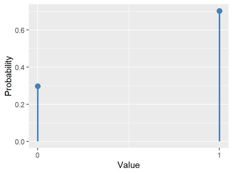 Example 11.8 Let \(G\) be the sex of the next new person you meet, where \(G = 0\) indicates that the person is male and \(G = 1\) indicates that the person is female. Then, the \(G\) is a Bernoulli random variable with the following probability distribution: \[ \begin{align} G= \begin{cases} 1,\quad\text{with probability $p$},\\ 0,\quad\text{with probability $1-p$}. \end{cases} \end{align} \tag{11.1}\]