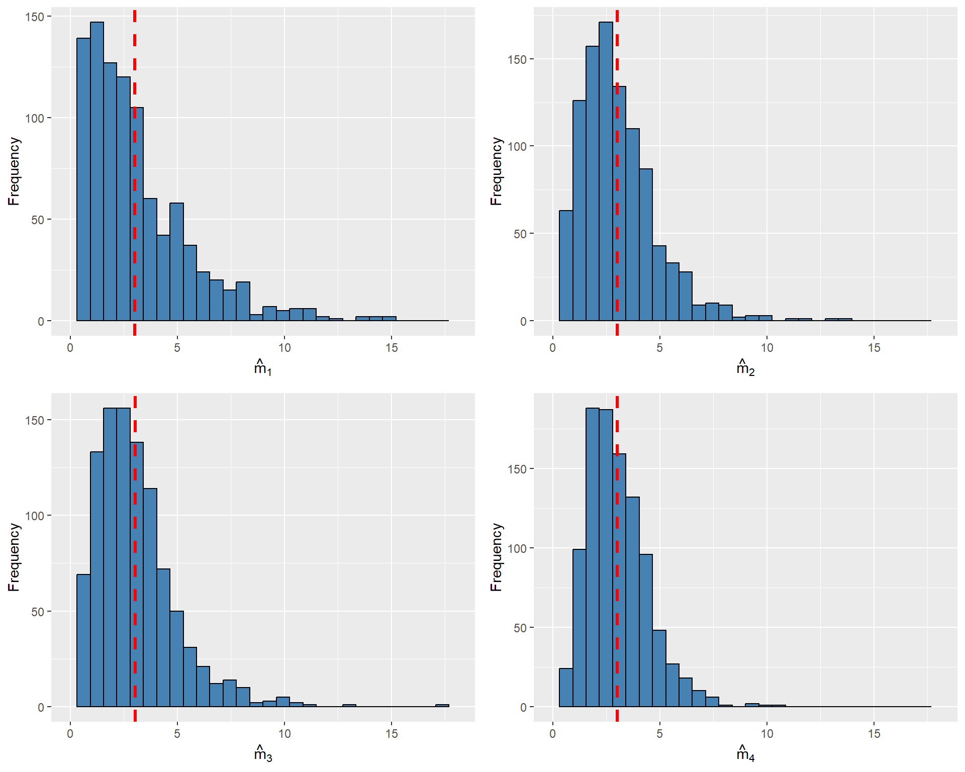 All four estimators are unbiased, with \(\hat{m}_4\) being the most efficient. In the following code chunk, we resample \(Y_1\), \(Y_2\), and \(Y_3\) from the \(\chi^2_3\) distribution \(1000\) times and compute each estimator for every resample. Figure 12.2 illustrates the sampling distribution of each estimator. As all estimators are unbiased, their estimated means are close to \(m = 3\). The figure also shows that \(\hat{m}_4\) is relatively more efficient, as its sampling distribution is more tightly clustered around its mean.