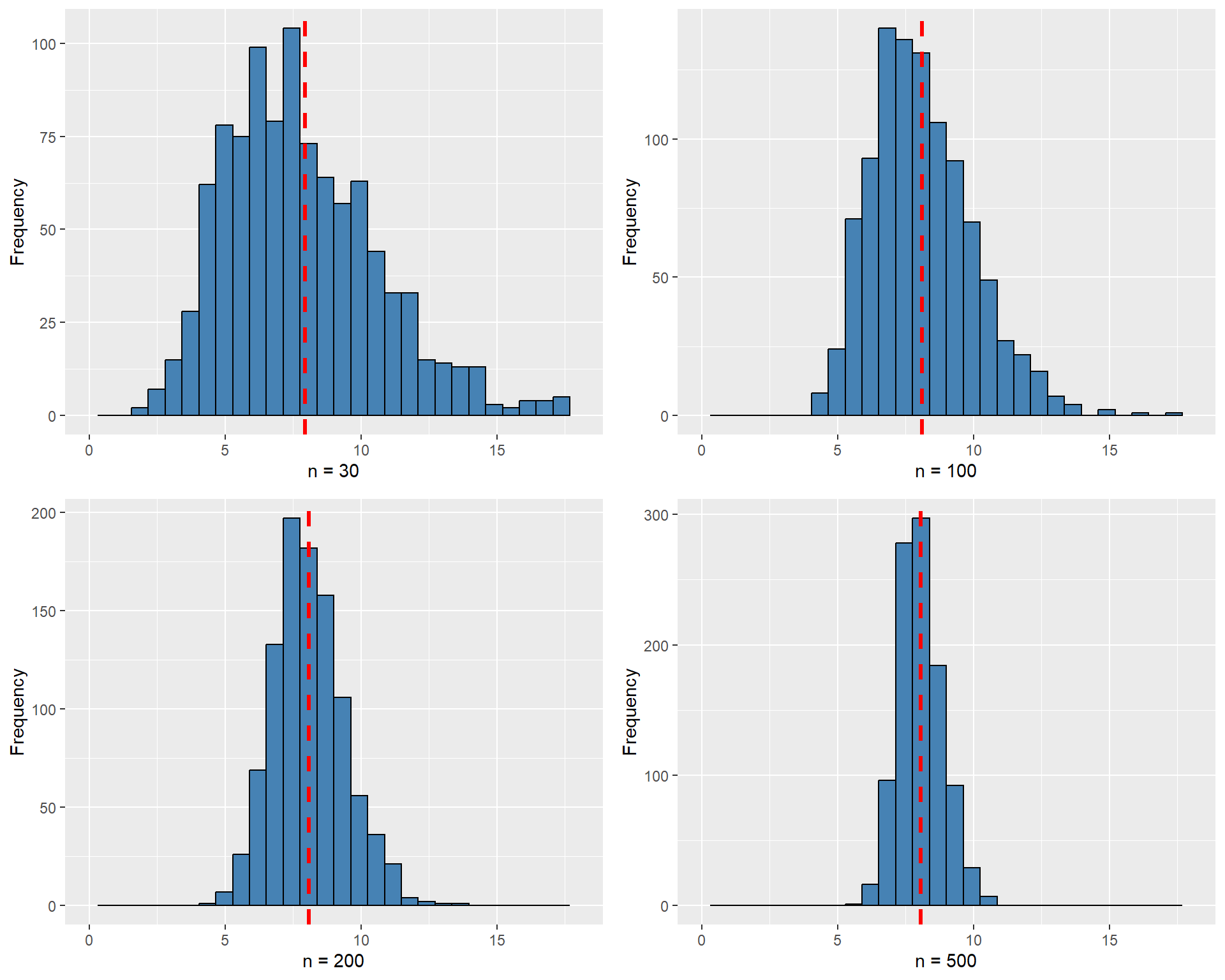 Example 12.4 For illustrating \(\E(s^2_Y) = \sigma^2_Y\) and \(s^2_Y \xrightarrow{p} \sigma^2_Y\), we assume that \(Y_1, Y_2, \dots, Y_n\) are i.i.d. random variables from the \(\chi^2_4\) distribution. Recall that if \(Y \sim \chi^2_4\), then \(\sigma^2_Y = 8\). In the following simulation exercise, we compute the sample variance \(1000\) times for different sample sizes, with \(n \in \{30, 100, 200, 500\}\). We then generate histogram plots of the sample variances. The simulation results are shown in Figure 12.3. The figure indicates that, as the sample size increases, the mean of the sample variances gets closer to the true value \(8\). Moreover, the sampling distribution becomes more tightly concentrated around the mean.