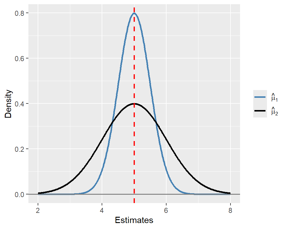 Example 12.2 Let \(\hat{\mu}_1\) and \(\hat{\mu}_2\) be two unbiased estimators of \(\mu_Y = 5\). Assume that the sampling distribution of \(\hat{\mu}_1\) is \(N(5, 0.5)\) and that of \(\hat{\mu}_2\) is \(N(5, 1)\). Then, we have \(\mathbb{E}(\hat{\mu}_1) = \mathbb{E}(\hat{\mu}_2) = 5\), indicating that both estimators are unbiased. However, \(\hat{\mu}_1\) is more efficient than \(\hat{\mu}_2\) because \(\text{Var}(\hat{\mu}_1) = 0.5 < \text{Var}(\hat{\mu}_2) = 1\). In Figure 12.1, we plot the sampling distributions of \(\hat{\mu}_1\) and \(\hat{\mu}_2\). Although both sampling distributions are centered at \(\mu_Y\), the sampling distribution of \(\hat{\mu}_1\) is more concentrated around \(\mu_Y\) than that of \(\hat{\mu}_2\), indicating that \(\hat{\mu}_1\) is more efficient than \(\hat{\mu}_2\).