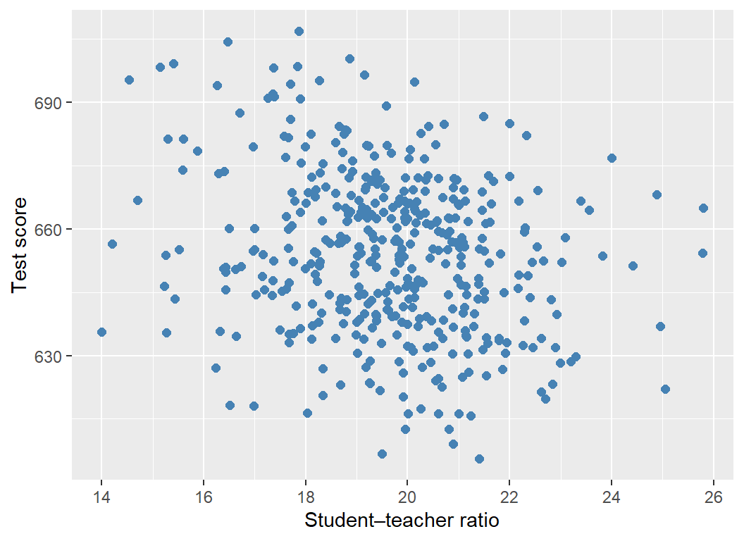A scatterplot is a plot of observations on two variables. We use the scatter plot to explore the relationship between two variables. For example, Figure 12.5 displays the scatterplot of the average test scores against the average student-teacher ratios for 420 California school districts. Each point in the figure represents an \((X, Y)\) pair for a school district, where \(X\) is the average student-teacher ratio, and \(Y\) is the average test score. The scatterplot in Figure 12.5 indicates a negative relationship between the average student-teacher ratio and the average test score. That is, as the student-teacher ratio increases, the average test score tends to decrease.