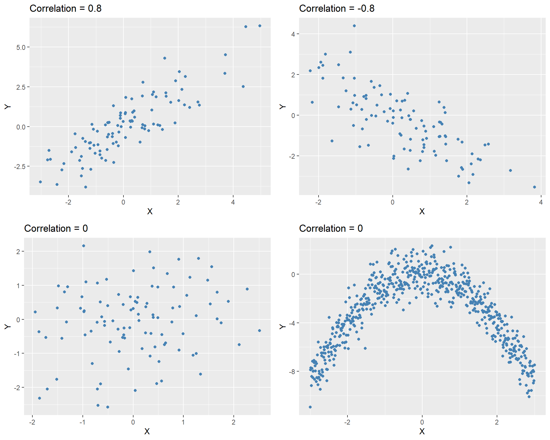 In Figure 12.6, we show four correlation coefficients for four hypothetical data sets. The last plot illustrates a non-linear relationship between \(X\) and \(Y\), even though the correlation coefficient between \(X\) and \(Y\) is zero.