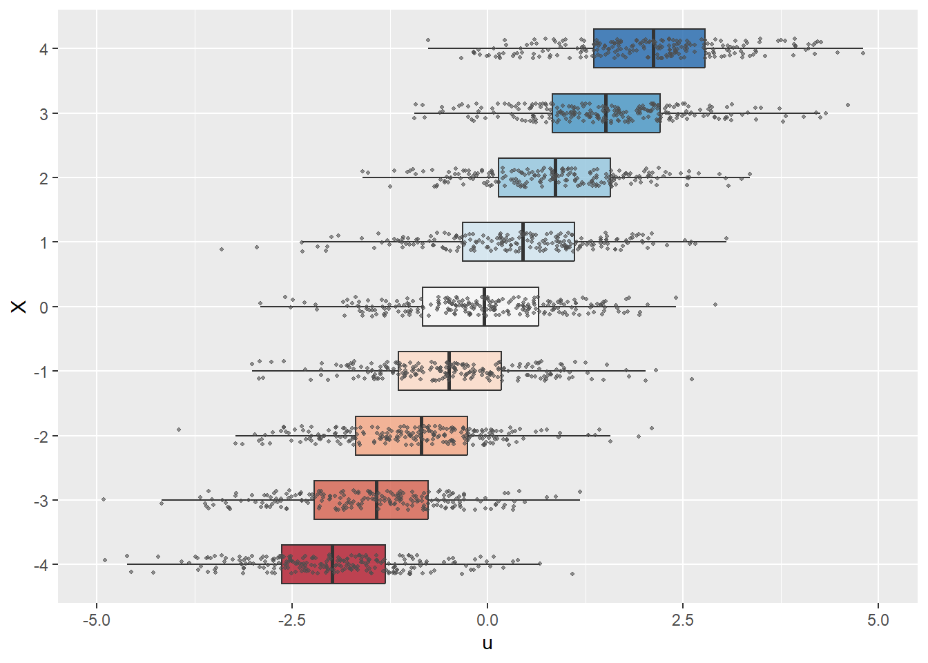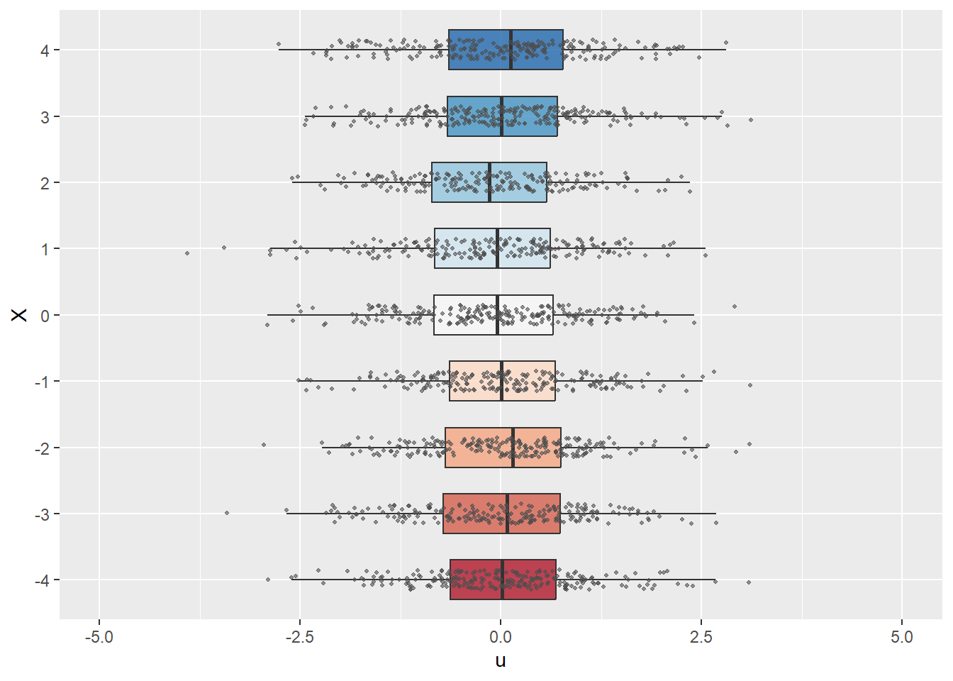 In Figure 13.4, we use boxplots to present the distribution of \(u\) against \(X\). In Figure 13.4(a), the conditional mean of \(u\) remains close to zero across all values of \(X\). Thus, in this case, \(\E(u|X)=0\) holds. On the other hand, Figure 13.4(b) shows that the mean of \(u\) varies with \(X\), indicating that \(\E(u|X)\) depends on \(X\).