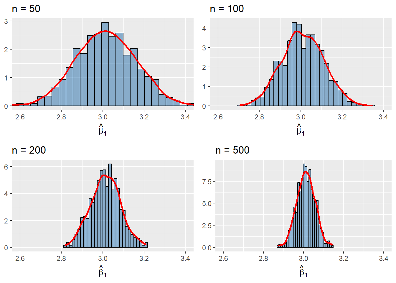 Each histogram and kernel density plot in Figure 13.5 is centered around the true value \(\beta_1=3\), indicating that the OLS estimator \(\hat{\beta}_1\) is unbiased. The shape of the histograms and kernel density plots are bell-shaped, suggesting that the sampling distribution of the OLS estimator \(\hat{\beta}_1\) resembles the normal distribution. We also observe that the variance of the OLS estimator decreases as \(n\) increases from \(50\) to \(500\). All of these observations are consistent with Theorem 13.1.