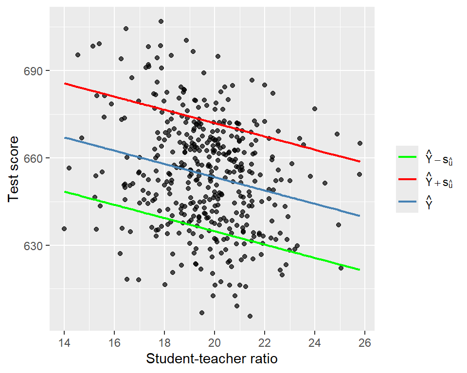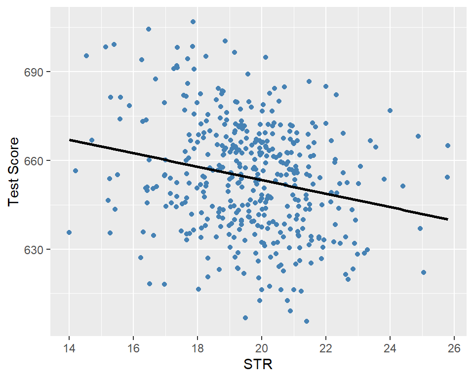 We consider the following regression model between test score (TestScore) and the student-teacher ratio (STR): \[ \begin{align} \text{TestScore}_i=\beta_0+\beta_1\text{STR}_i+u_i, \end{align} \tag{13.3}\] for \(i=1,2,\dots,n\).