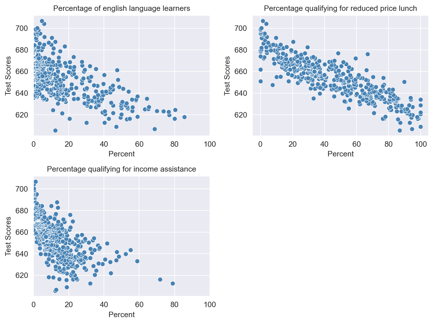 Figure 16.3 shows the scatterplots between these variables and the test scores. We observe that each variable is negatively correlated with the test scores.