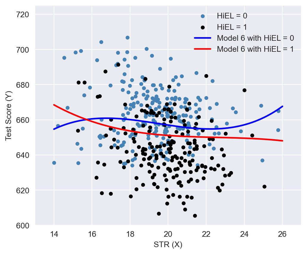 In Figure 17.10, we present the estimated regression functions for Model 6 when HiEL = 0 and HiEL = 1. Although the two regression functions appear different, the slopes are nearly identical when str take values between 17 and 23. Since this range encompasses nearly all observations, we can reasonably conclude that nonlinear interactions between the fraction of English learners and the student-teacher ratio can be disregarded.