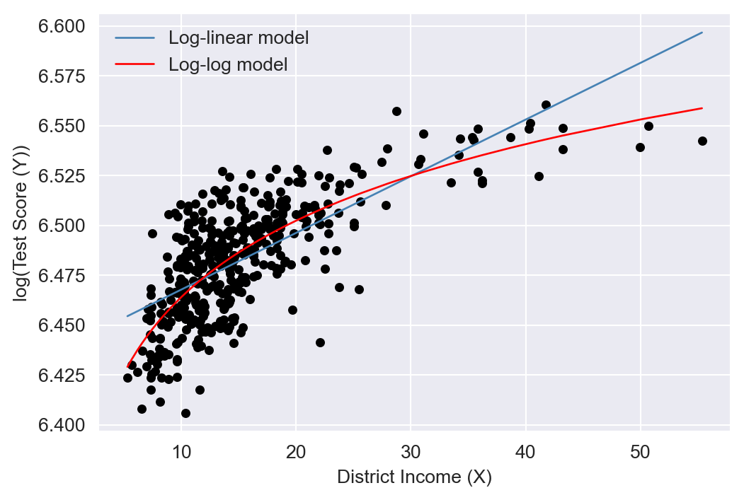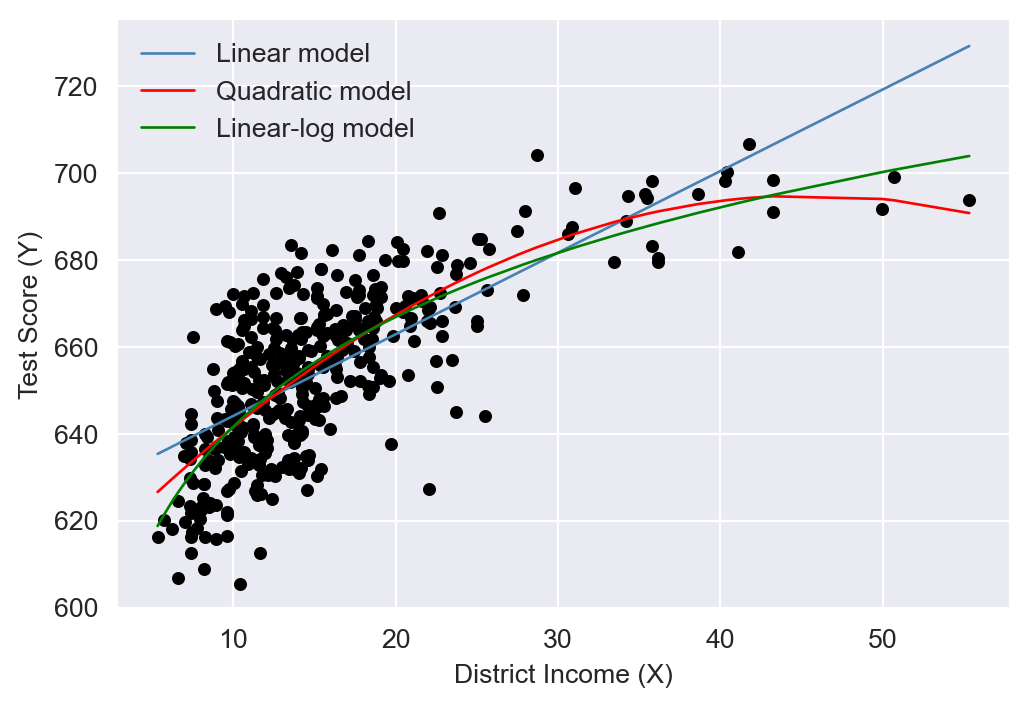 \[ \begin{align} &\text{Linear}:\quad \text{TestScore}=\beta_0+\beta_1\text{Income}+u,\label{eq3}\\ &\text{Quadratic}:\quad \text{TestScore}=\beta_0+\beta_1\text{Income}+\beta_2\text{Income}^2+u,\label{eq4}\\ &\text{Cubic}:\quad \text{TestScore}=\beta_0+\beta_1\text{Income}+\beta_2\text{Income}^2+\beta_3\text{Income}^3+u.\label{eq5} \end{align} \]
