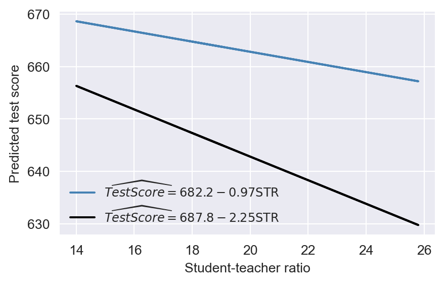 strdeclines by two students, test scores are expected to increase by \(-0.73\times (-2)=1.46\) points. Since the model is linear, this effect is independent of the class size. - Using the estimation results for Model 5 and assuming that