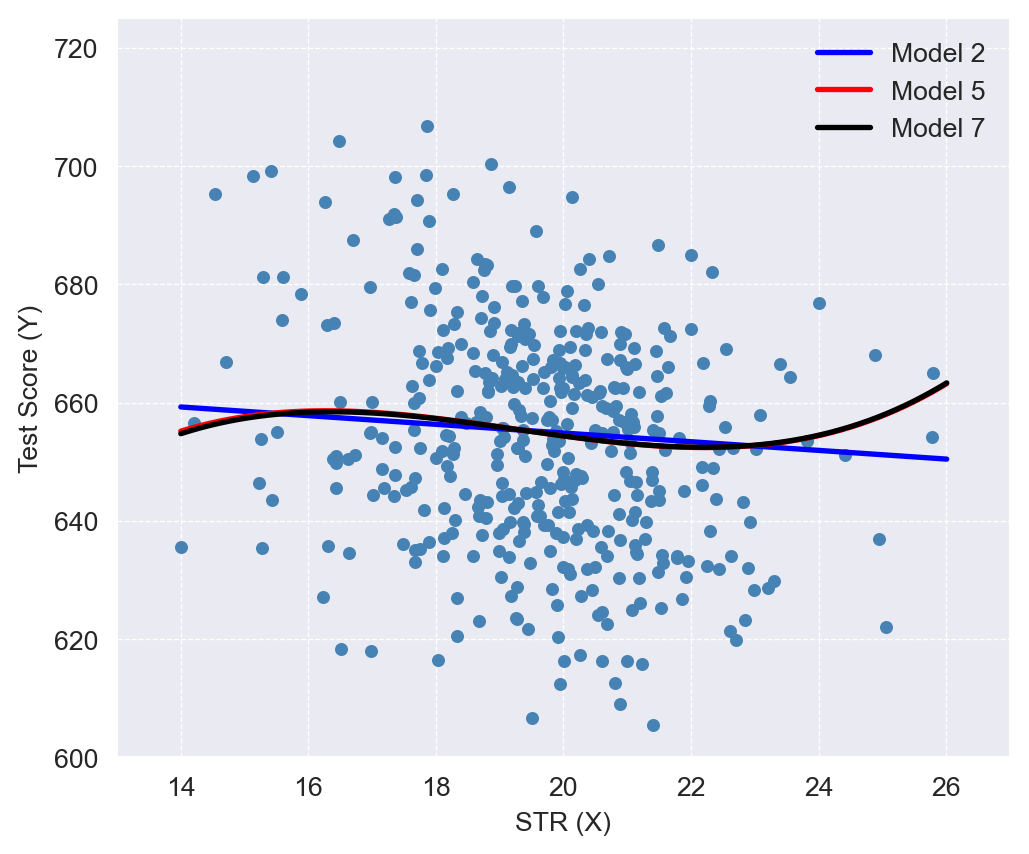 The nonlinear specifications in Table 17.7 are most easily interpreted graphically. In Figure 17.9, we present plots of the estimated regression functions for Models 2, 5, and 7, along with a scatterplot of testscr and str. For each curve, we compute predicted values by setting each independent variable, other than str, to its sample average. These estimated regression functions show the predicted test scores as a function of str, with other independent variables fixed at their sample averages. The figure illustrates that the estimated regression functions are all quite similar to one another.